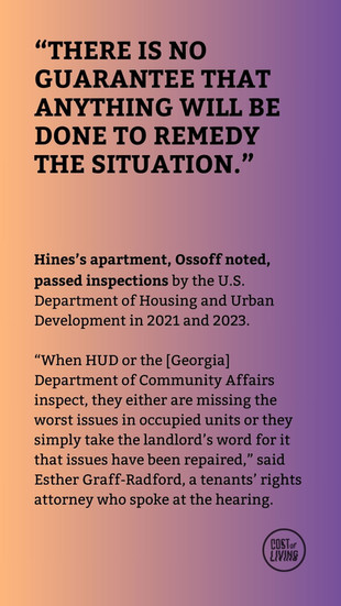 Hines’s apartment, Ossoff noted, passed inspections by the U.S. Department of Housing and Urban Development in 2021 and 2023. “When HUD or the [Georgia] Department of Community Affairs inspect, they either are missing the worst issues in occupied units or they simply take the landlord’s word for it that issues have been repaired,” said Esther Graff-Radford, a tenants’ rights attorney who spoke at the hearing. According to Ayanna Jones, senior litigation counsel at the Atlanta Volunteer Lawyers Foundation, “Even when [HUD’s] compliance line is contacted, there is no guarantee that anything will be done to remedy the situation.”